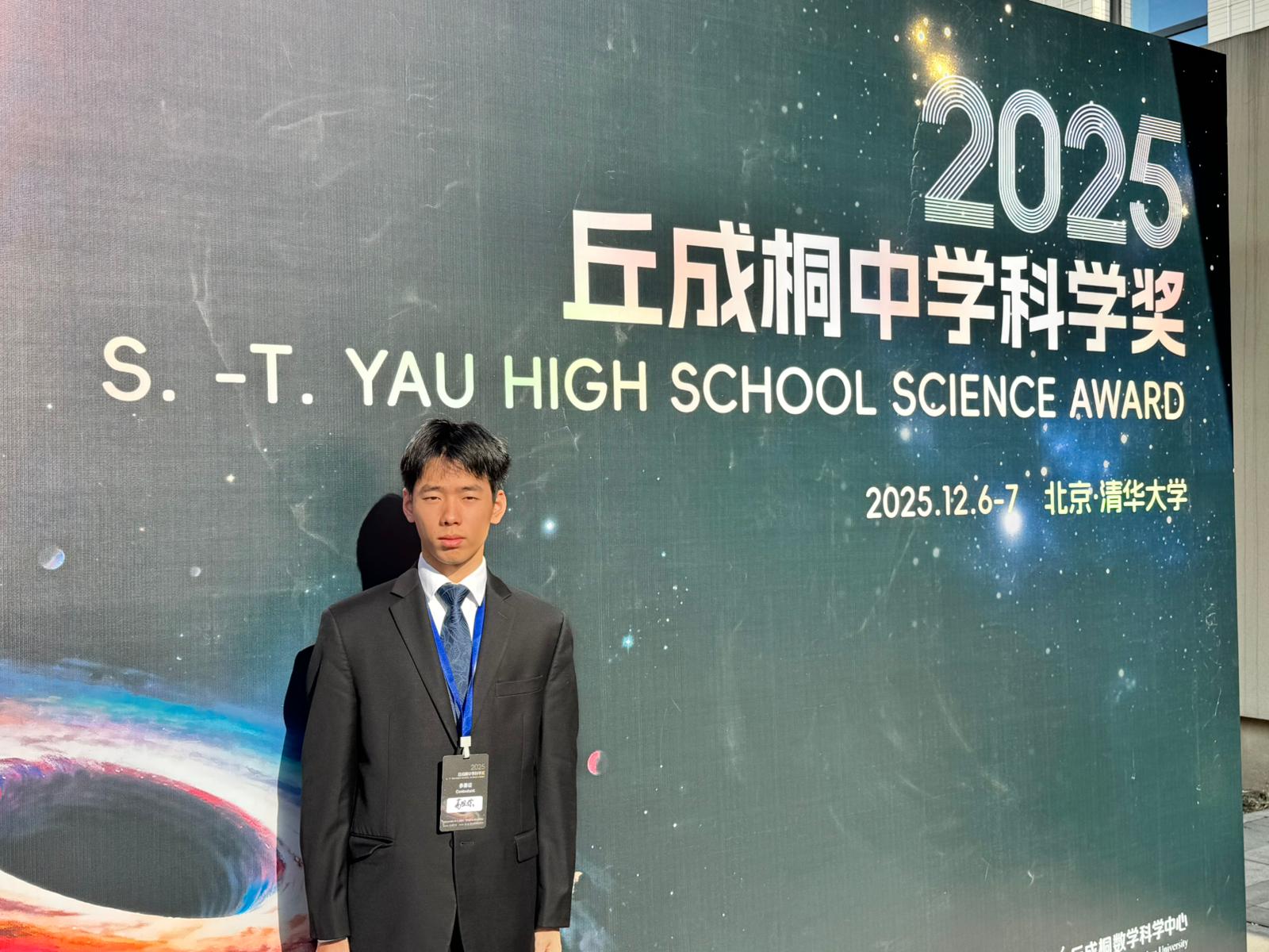 The " S.-T. Yau High School Science Award" includes six competition categories: Mathematics, Physics, Chemistry, Biology, Computer Science, and Economic and Financial Modeling. After intense competition in two rounds of preliminary contests, our student Ge Tanliang from S.5A successfully advanced to the Asia Regional Finals among over 50 teams from various Asian regions. He was the only student from a Hong Kong school to progress to the third round of judging in the Chemistry category. . On 1st November 2025, during the third-round oral defense final held at The Chinese University of Hong Kong, Tanliang stood out and won the Silver Award (the Gold Award in the Chemistry category was not awarded this year). After passing the strict academic plagiarism checks in both Hong Kong and mainland China and the public exhibition review, his research report was officially qualified and confirmed on 20th November, 2025, to have earned him the Silver Award qualification in the Asia regional competition. He has also advanced to the Global Final of the S.-T. Yau High School Science Award held in Tsinghua University, Beijing from 5th to 7th December, 2025. In the final round, Ge Tanliang received Honourable Mention Award in Chemistry Category, along with a crystal trophy and a scholarship.