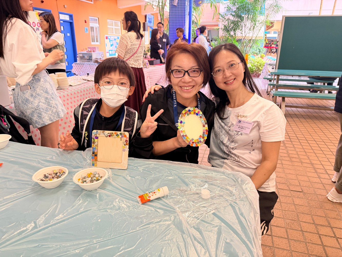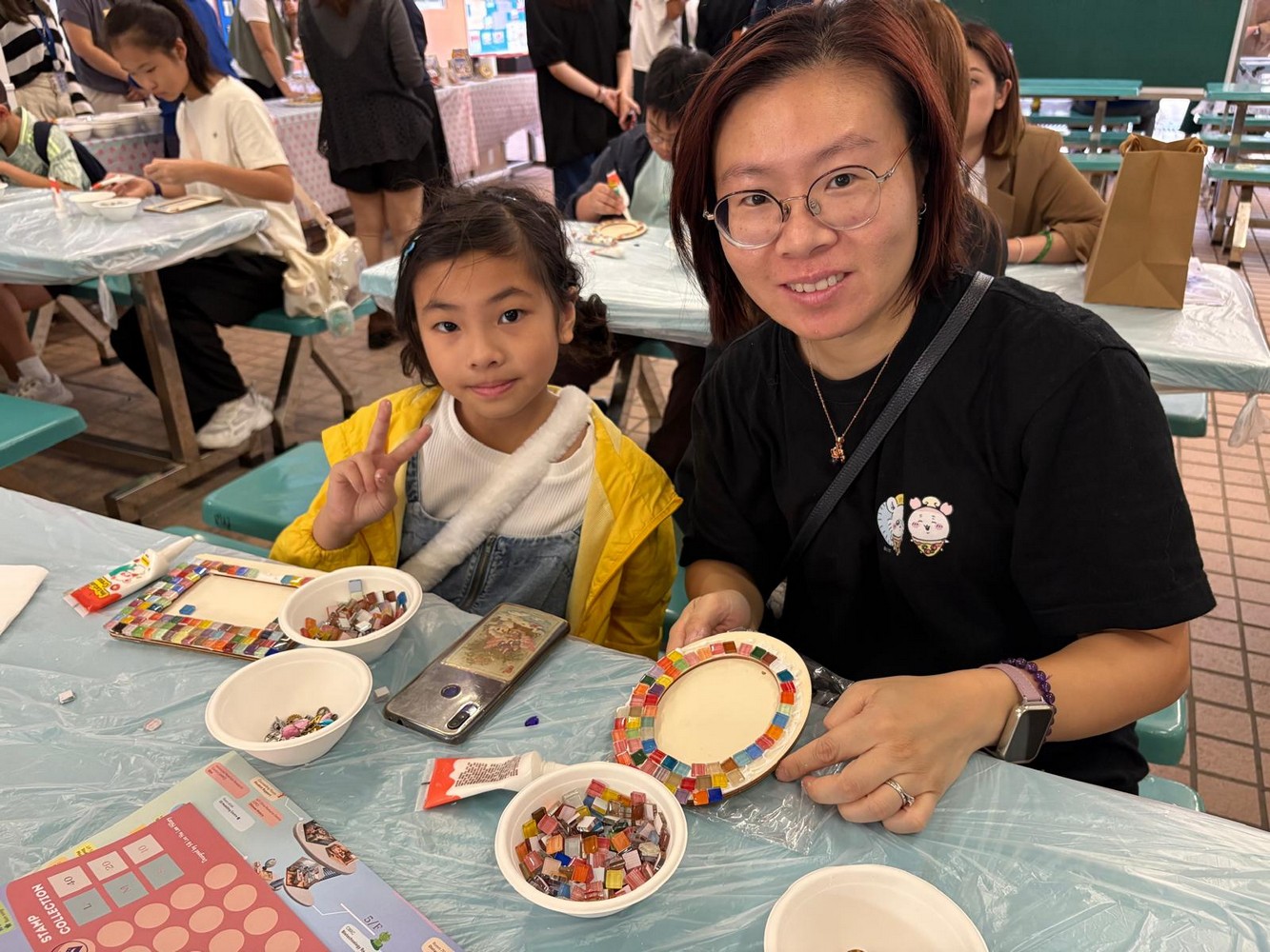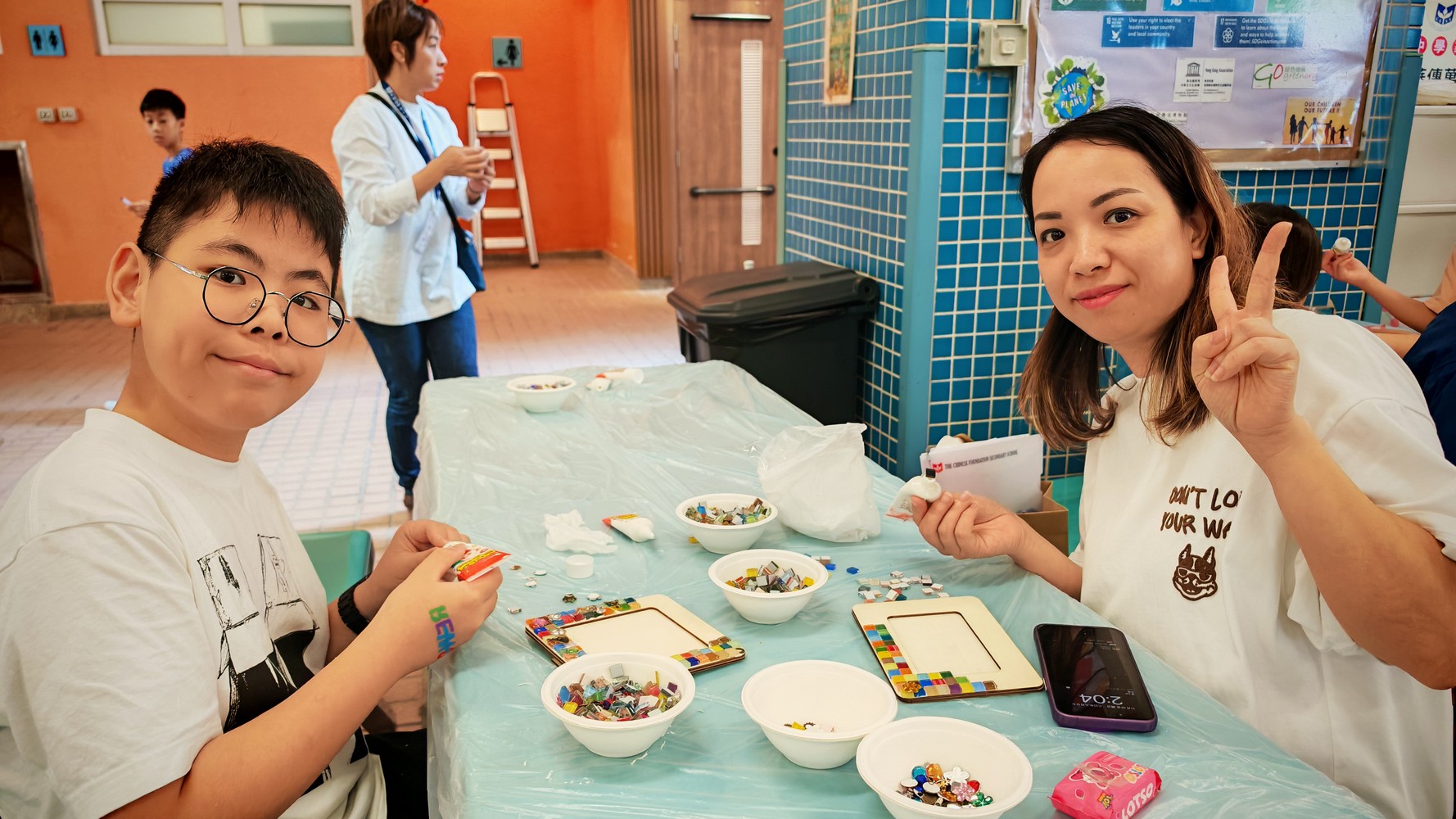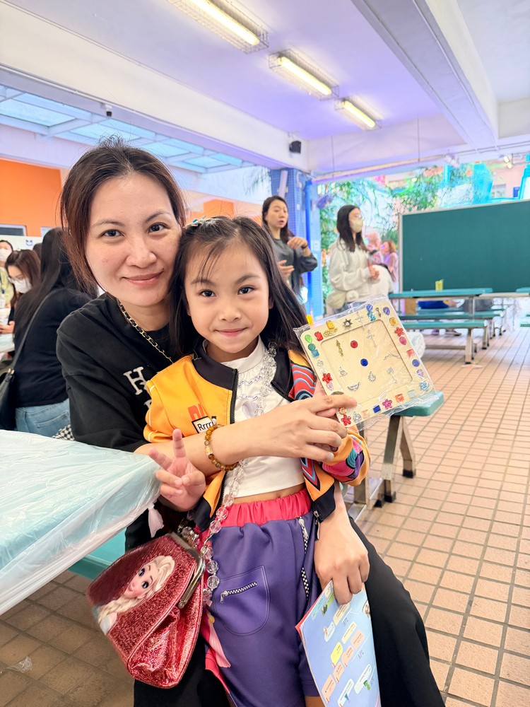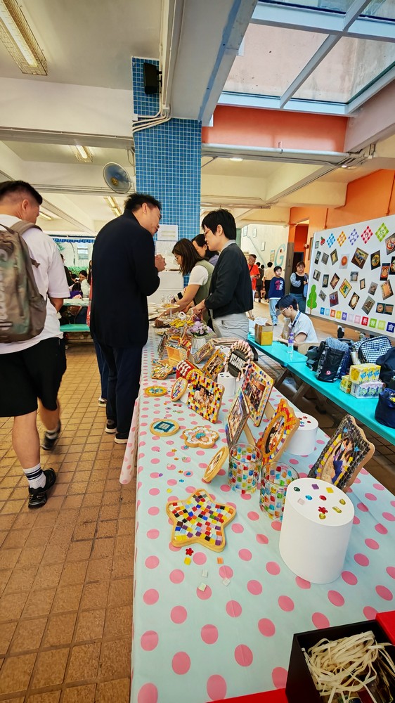 在現場佈置方面,我們首次以海報形式展示家教會的口號、工作坊成果及相關資訊,讓參加人士一目了然。工作坊活動深受學生和家長喜愛,許多訪校家長與孩子一起動手,運用色彩繽紛的馬賽克與各項飾品,包括機械齒輪,設計出獨一無二的相架。每位參與者創作的作品都別具風格,更有小朋友把相架視為畫框,不僅在相架邊緣貼上馬賽克,還以奶油膠在相框中央進行創作,打造出與眾不同的個人作品,別具創意。見到攤位如此受歡迎,我們既喜見成功,也心存感恩。