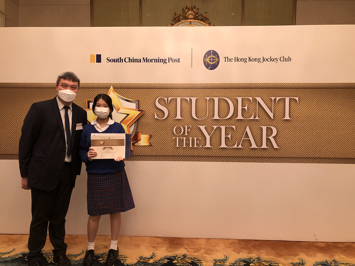 SCMP continued to hold one of the most prestigious annual secondary school events - The Student of the Year Awards in its 41st year. The event aims at recognizing and encouraging Hong Kong’s young leaders of tomorrow. There are nine different categories, namely Visual Arts, Linguistic, Community Contribution, Sports, Science and Mathematics, Performing Arts, Best Improvement, Best Devotion to School and Grand Prize. Pui Yat Hau (S.5A) had served the school through peer counselling, moral and civic education, environmental protection and inter-house competitions since junior form. She lived up to expectations and received a merit prize in the "Best Devotion to School" category. We hereby congratulate once again on Yat Hau’s success.
