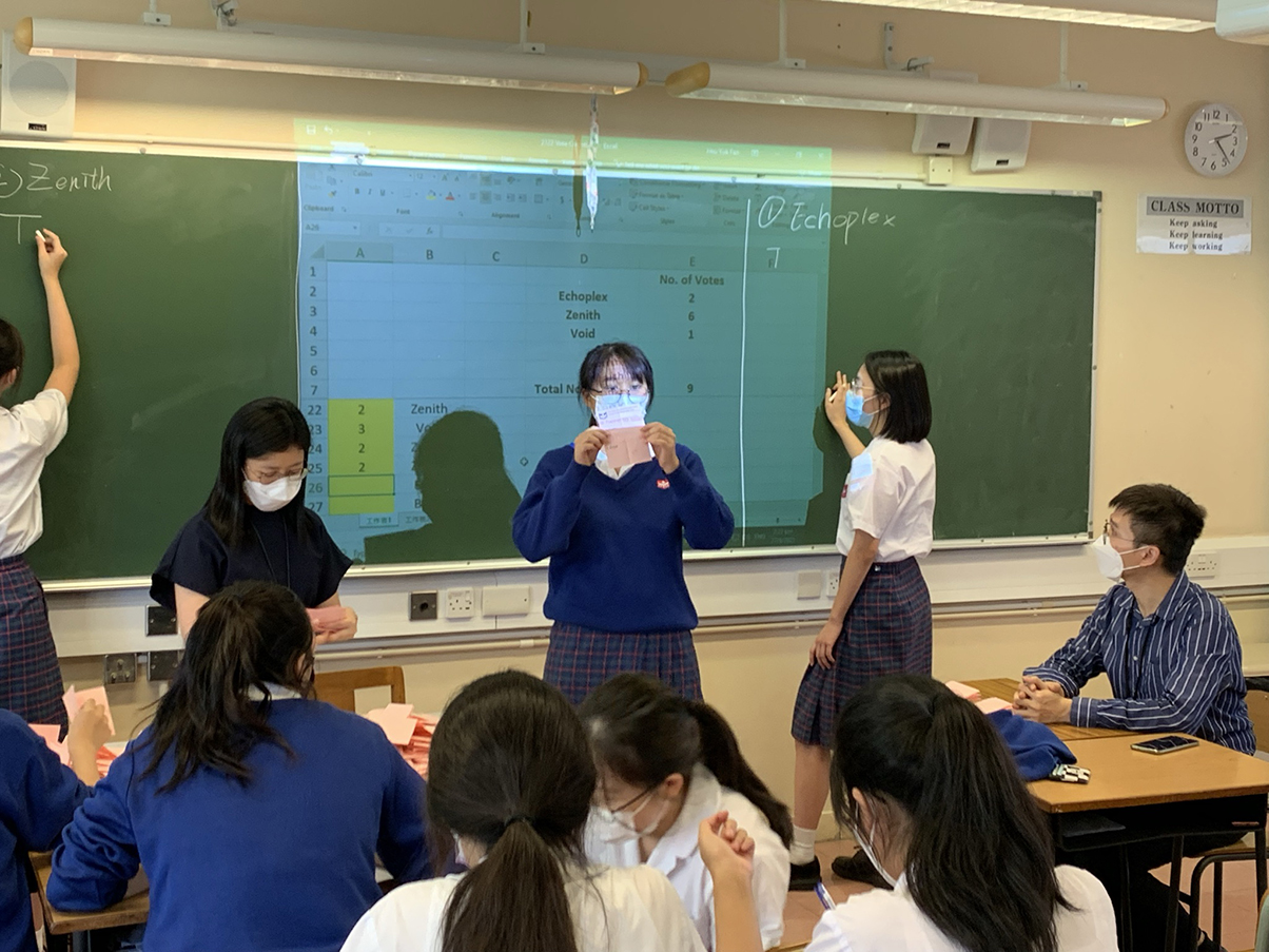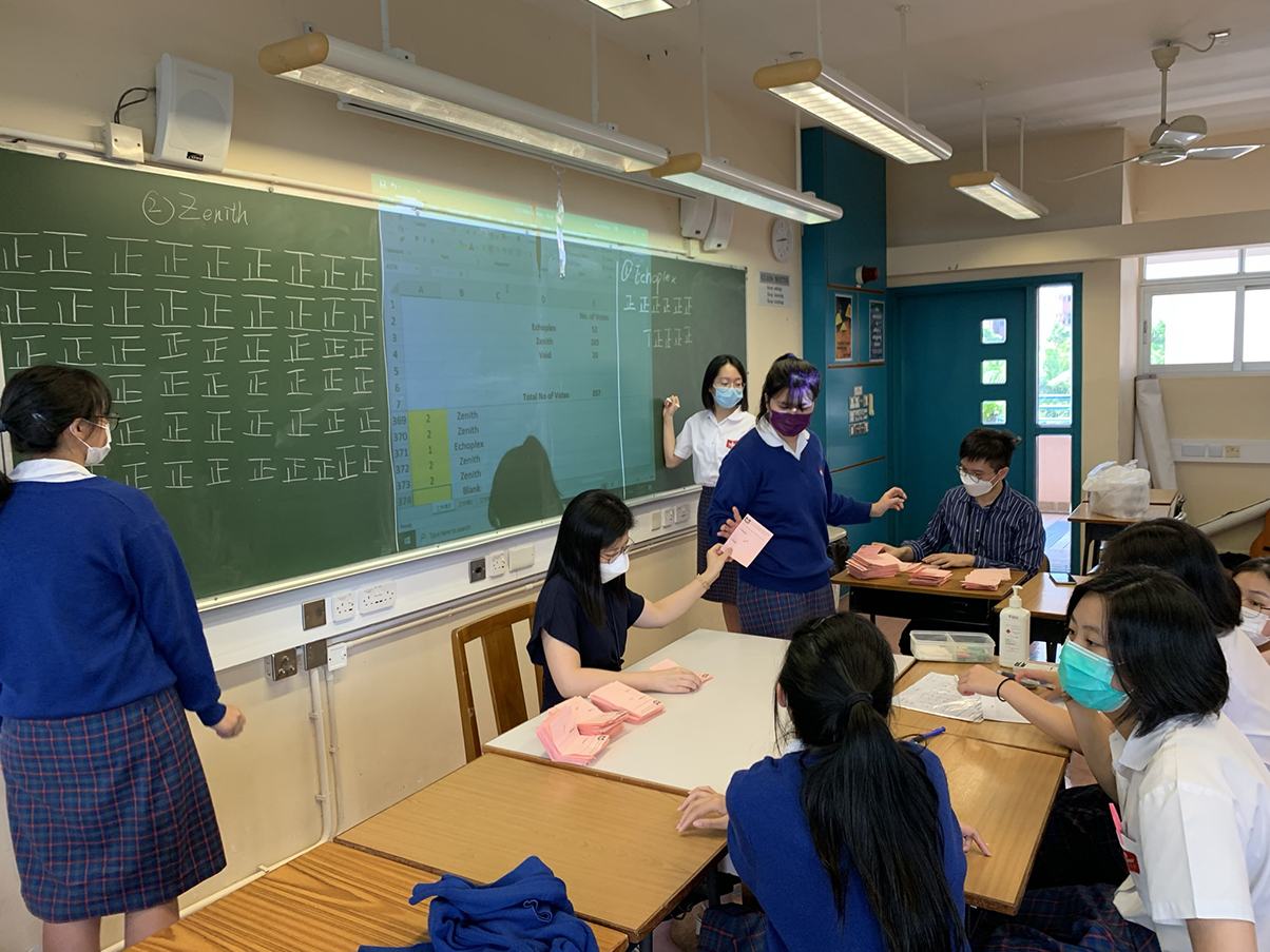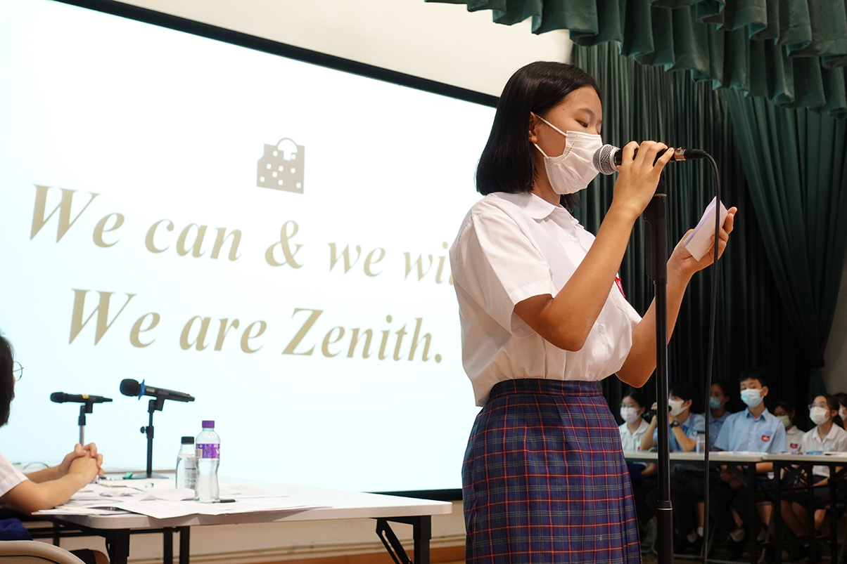 Two nominated cabinets, namely Echoplex and Zenith, ran for the 13th Student Council this year. Both teams shared their visions and policies with students and answered enquiries from different levels in the Election Forum on 21st September, 2021. On 27th September, the election was held at the Hall. The result was as follows: Echoplex got 108 votes while Zenith got 568 votes. Zenith was elected as the 13th Student Council of the School.