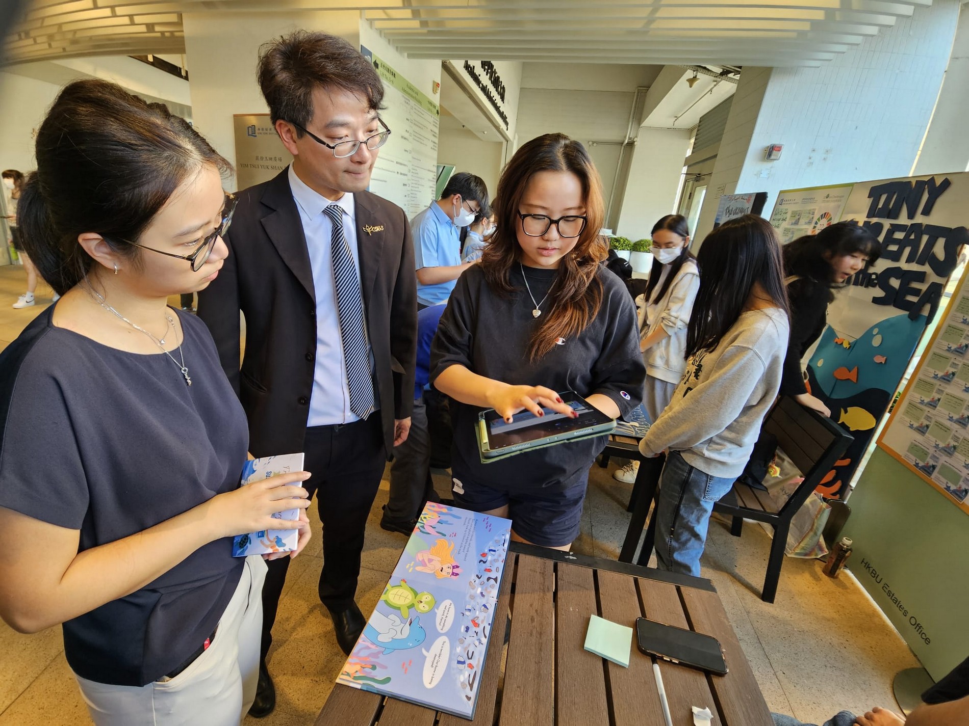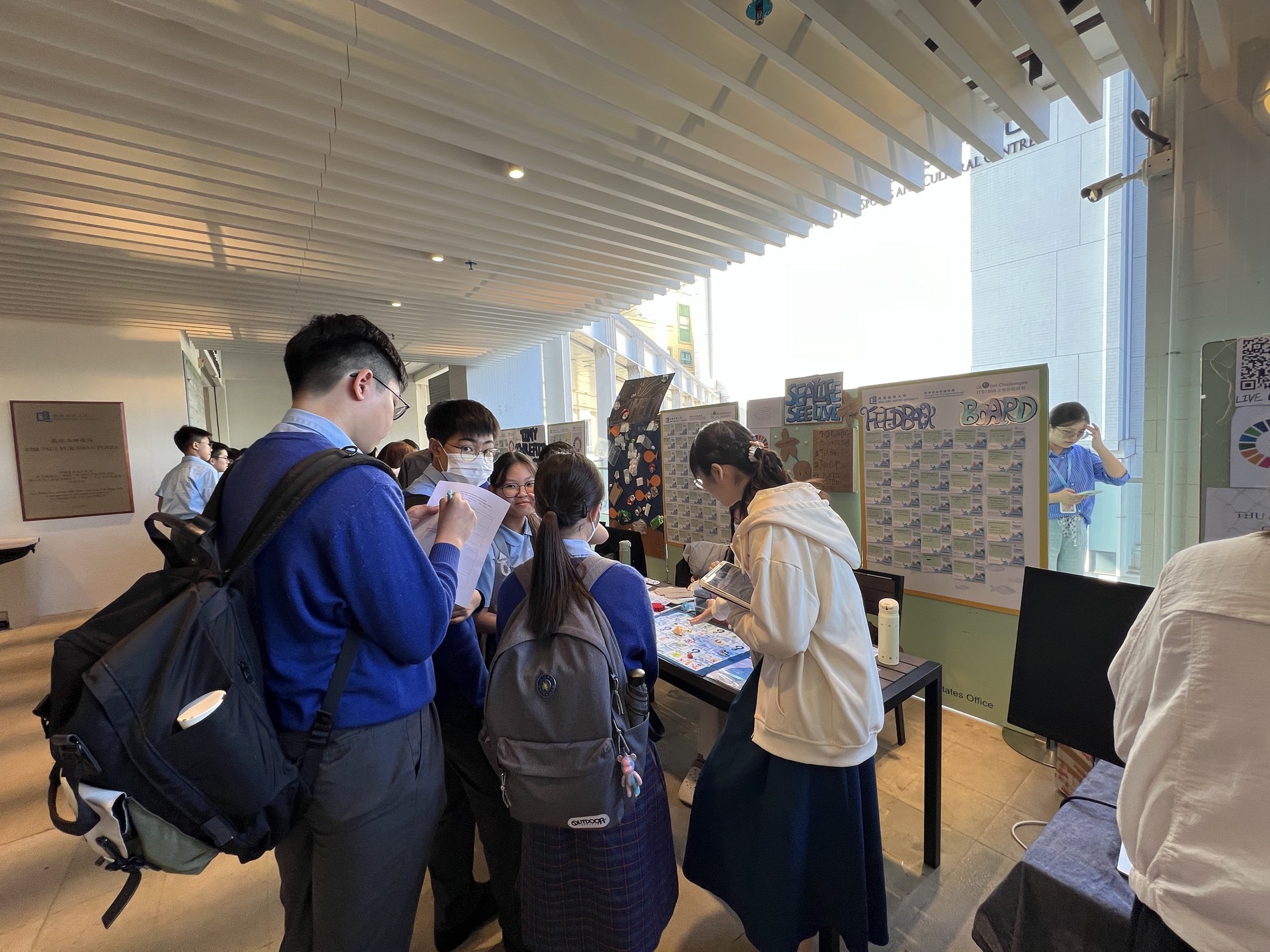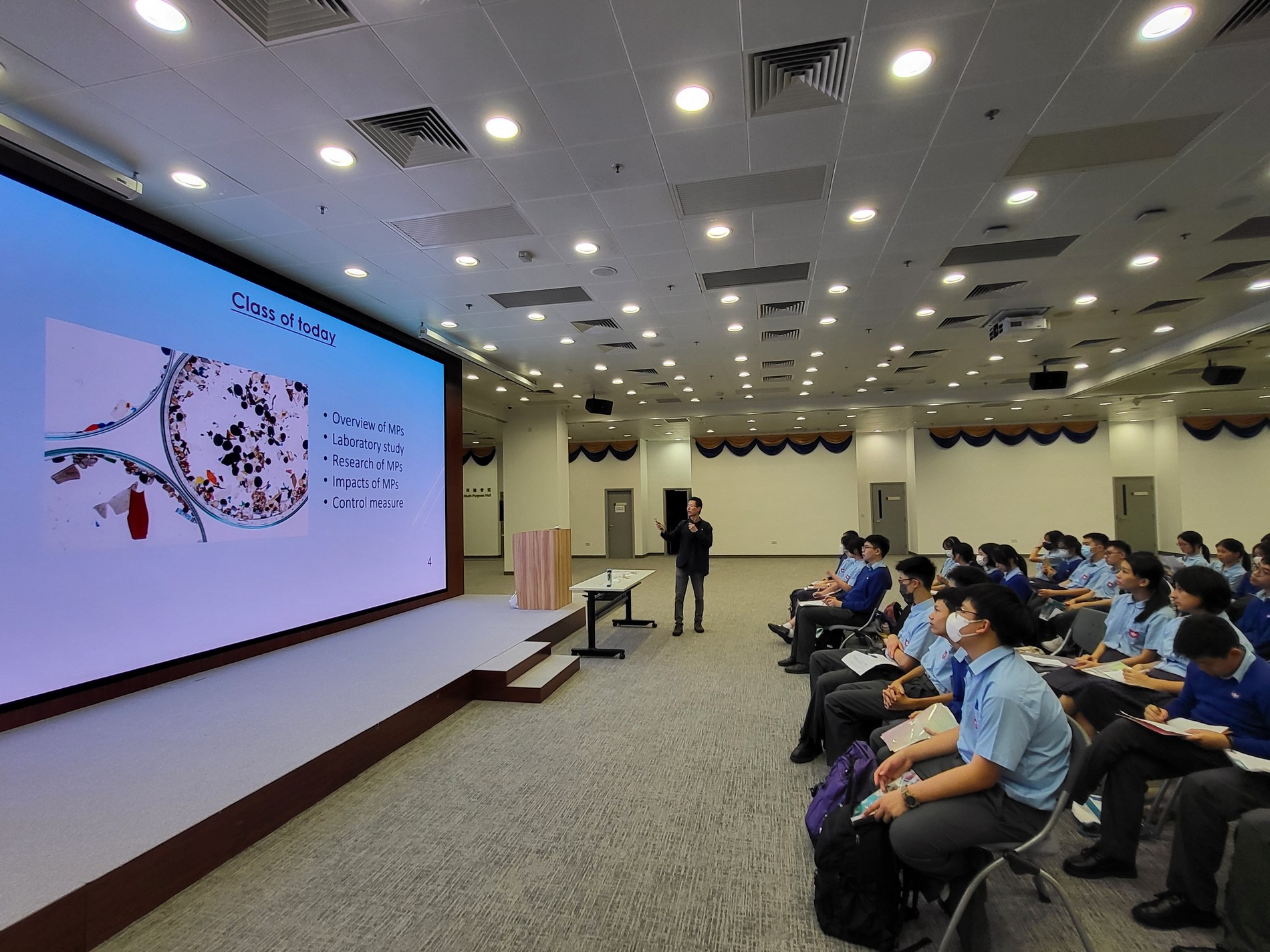 Our seventy S.3 students and teachers had a contented and joyful visit to the Exhibition “Transdisciplinary Connections in Sustainable Ocean” on 12 Nov 2024 (Tue) in HK Baptist University. The Exhibition had showcased 22 booths featuring student ideas from Division of Transdisciplinary Undergraduate Programmes (DTUP) on promoting a sustainable human-water relationship, with the targeted SDG 14 “Life Below Water”. After the Exhibition, our students were honored to attend a lecture delivered by Dr. Patrick Y.K. Yue (Senior Lecturer, Associate Programme Director for BSc (Hons) in Applied Biology) titled “Small Things, Giant Impacts – Microplastics 101”, and realized the importance on reducing plastic consumption for the sake of human health and the nature.