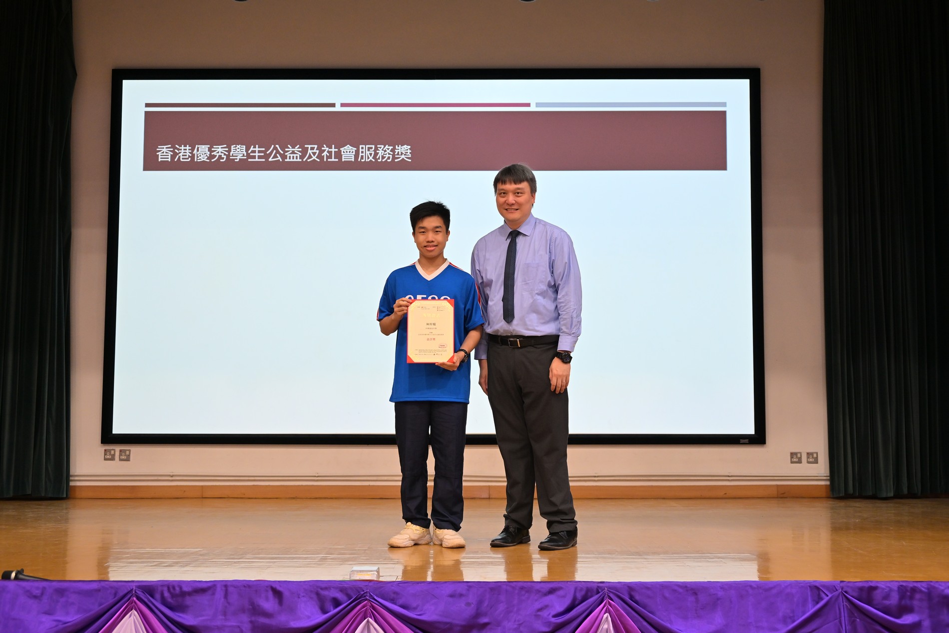 Or Tsz Lung of Class 4A was awarded the first Hong Kong Outstanding Student Community Service Award co-organised by the Hong Kong Federation of Education Workers and Wen Wei Po in recognition of his outstanding performance in the national flag team and community services.