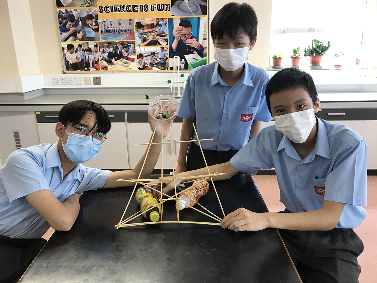 The captioned STEM Education Challenge (Secondary Section) is divided into preliminary and final competitions. It aims to allow students to develop creativity, improve their hands-on creation and problem-solving skills as well as allowing them to learn teamwork spirit. Each team was provided with bamboo sticks, rubber bands, bean bags and other materials. Students use the materials provided to develop their creativity, and work with the team members to design and produce the lever fort, and complete the preliminary competition in the school campus. The team with the best results will advance to the final on behalf of the school. The following students won the Merit Award in the final.