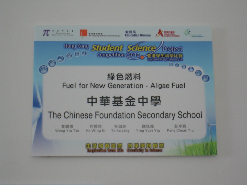 The Hong Kong Student Science Project Competition 2010 is jointly organized by the Innovation and Technology Commission, The Hong Kong Federation of Youth Groups, the Education Bureau, the Hong Kong Science Museum and supported by the Hong Kong Science and Technology Parks Corporation. Six S2 students participated in this competition, under the main theme of “Inspiration from Life Creativity in Science”, and embedded the Second runner up in the secondary school division and Green Energy Award.