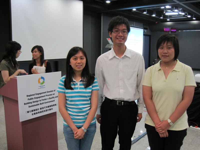 Council for Sustainable Development organized a series of forum to collect comment from professionals, government officials and the general public on “Building Design to Foster a Quality and Sustainable Built Environment” Response Document 2009. The document covered (1) Sustainable building design (2) Grant gross floor area (GFA) concession policies (3) Energy efficient building design and installations. Lam Wing Sum from 6S1 and Lam Hermonie from 6A were the two representatives of our school to participate in the public engagement, to identify the proper solutions for these key policy issues to foster a more environmentally friendly and prosperous society.