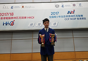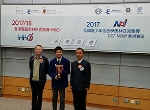 Hong Kong Olympiad in Informatics (HKOI) is an annual software competition for secondary students in Hong Kong, emphasizing on problem solving techniques and programming skills. It is organized by the Hong Kong Association of Computer Education (HKACE), Education Bureau, the Government of the Hong Kong Special Administrative Region (EDB), and co-organized by Department of Computer Science and Engineering, Faculty of Engineering, The Chinese University of Hong Kong. Lai Wing Yin (S5) was awarded a Gold Medal in HKOI 2017/18. He was also given The Second Class Award in National Olympiad in Informatics in Provinces (NOIP) 2017/18. [Organizer’s website: http://www.hkoi.org]